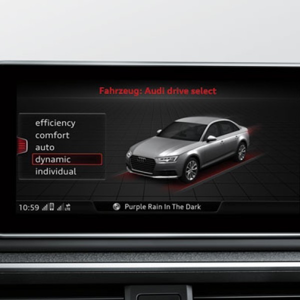 Audi drive select pozwala kierowcy elektronicznie sterować pojedynczymi podzespołami samochodu. Oprócz trybów comfort, auto i dynamic, system zawiera tryb efficiency i w połączeniu z radiem MMI lub z nawigacją MMI plus z MMI touch, tryb individual. Wraz z wyposażeniem w Audi drive select, charakter Twojego Audi można elastycznie dopasowywać do upodobań kierowcy i do przebiegu trasy.